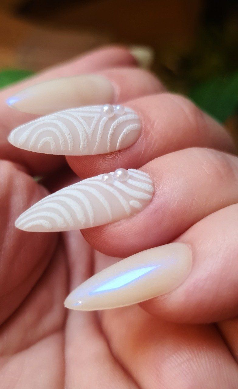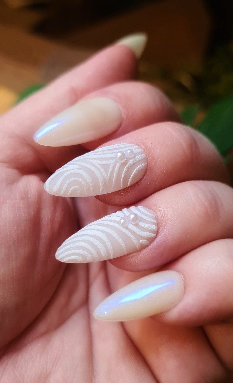 Un blanc milky irisé qui s'illuminera sous la lumière, pour offrir a vos mains l'élégance absolue !
