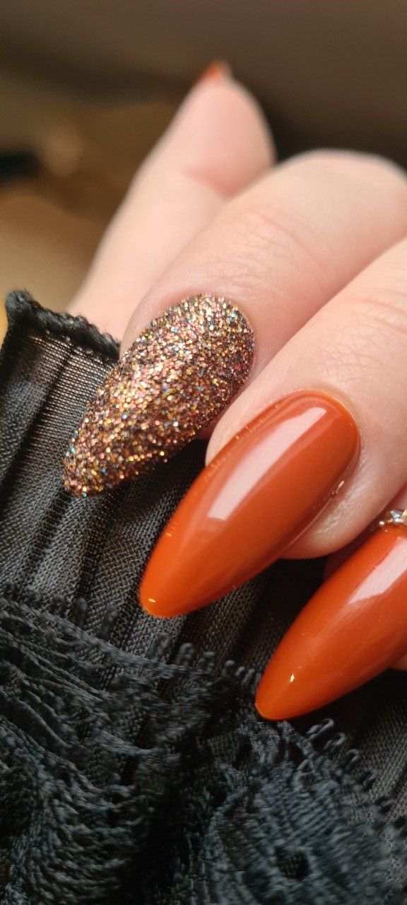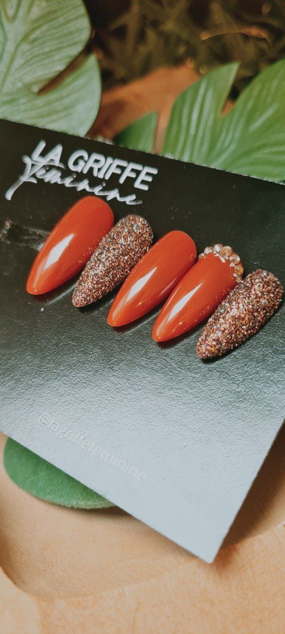 Chaque ongle présente des teintes de brun, caramel et brique, sublimées par de fines paillettes marron qui capturent la lumière pour un éclat sophistiqué et élégant.