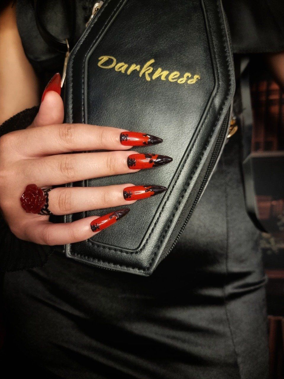 Entrez dans l'atmosphère envoûtante d'Halloween avec notre collection exclusive de press on nails associé à notre sac coffin pour un total look envoûtant !